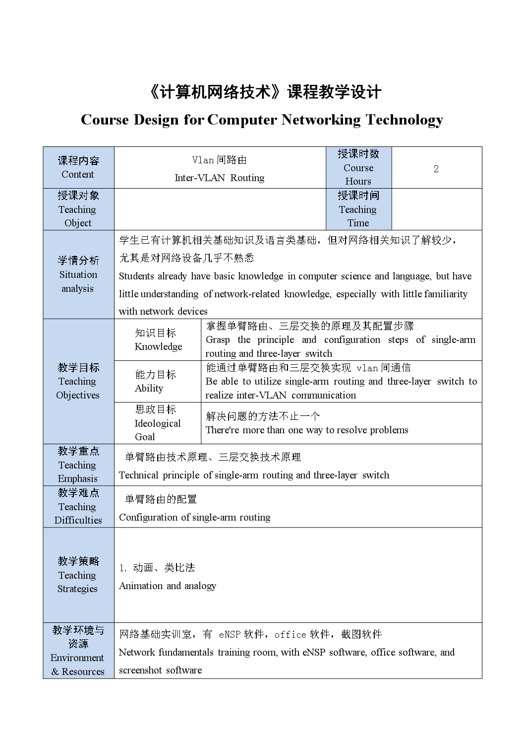 《计算机网络技术》教案——VLAN间路由 Teaching Plan of Computer Networking Technology - Inter-VLAN Routing