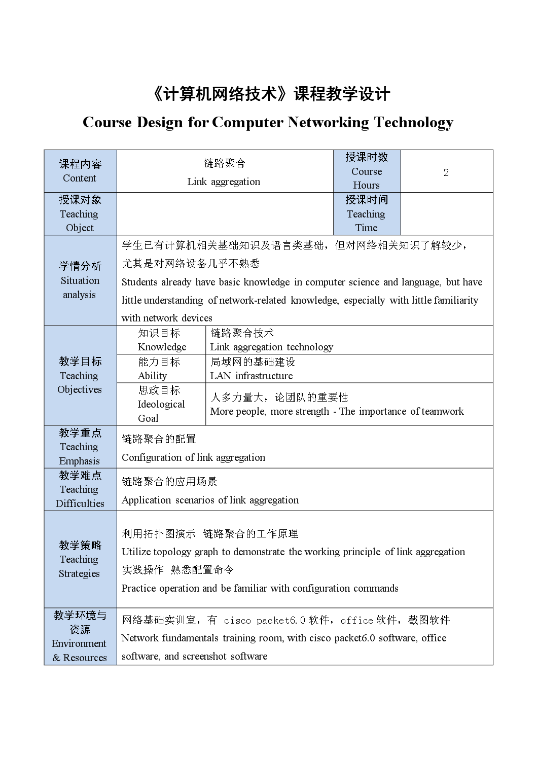 《计算机网络技术》教案——链路聚合技术 Teaching Plan of Computer Networking Technology - Link Aggregation Technology