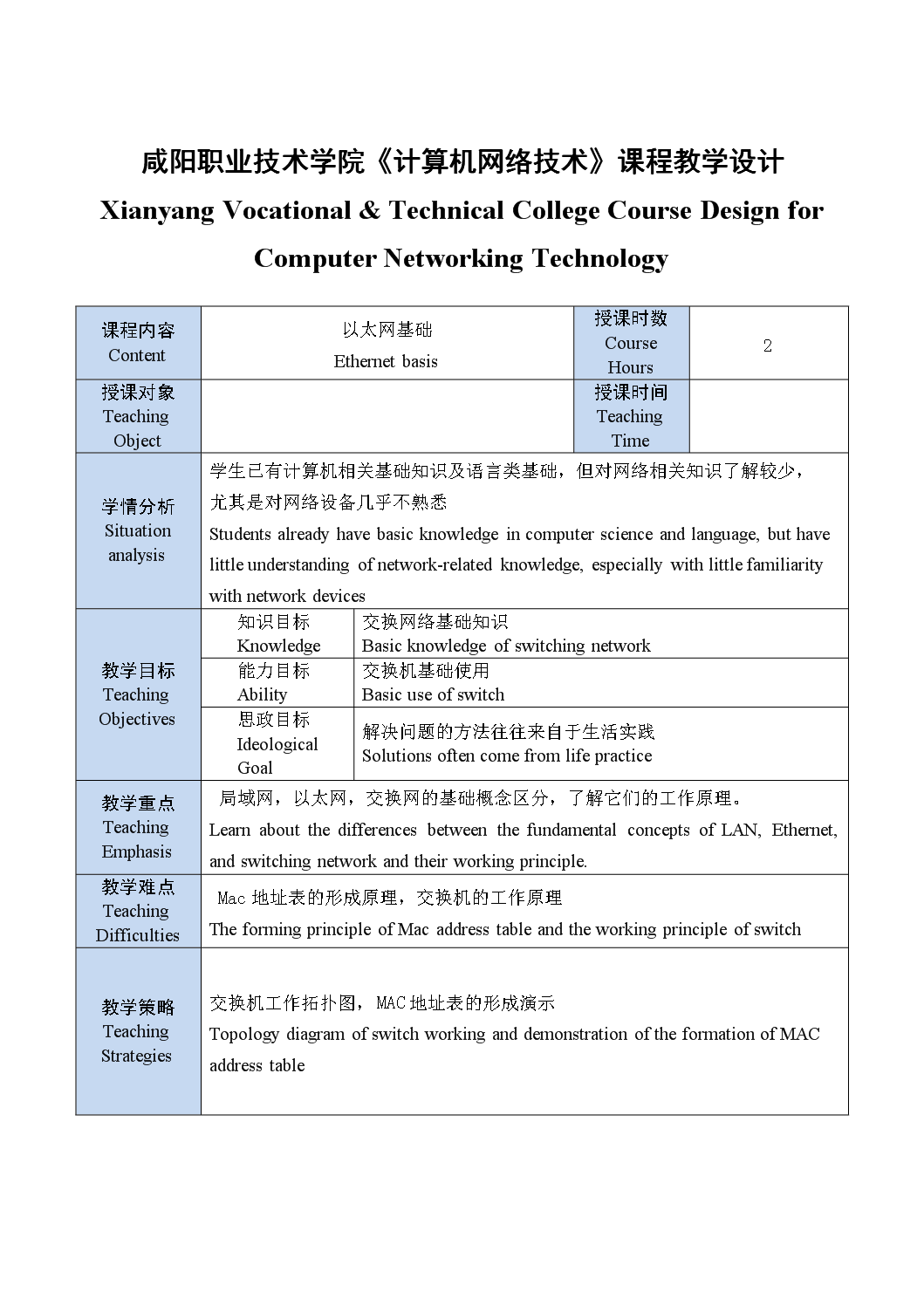 《计算机网络技术》教案——以太网基础 Teaching Plan of Computer Networking Technology - Ethernet Basis