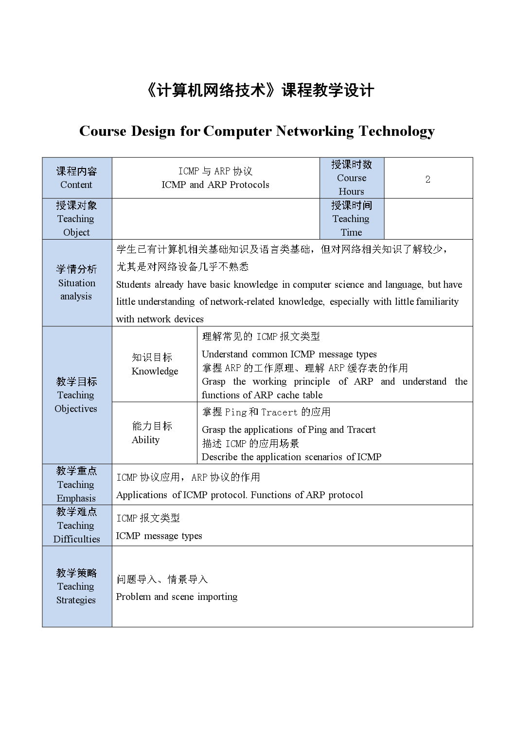 《计算机网络技术》教案——ICMP协议与ARP协议 Teaching Plan of Computer Networking Technology - ICMP Protocol and ARP Protocol