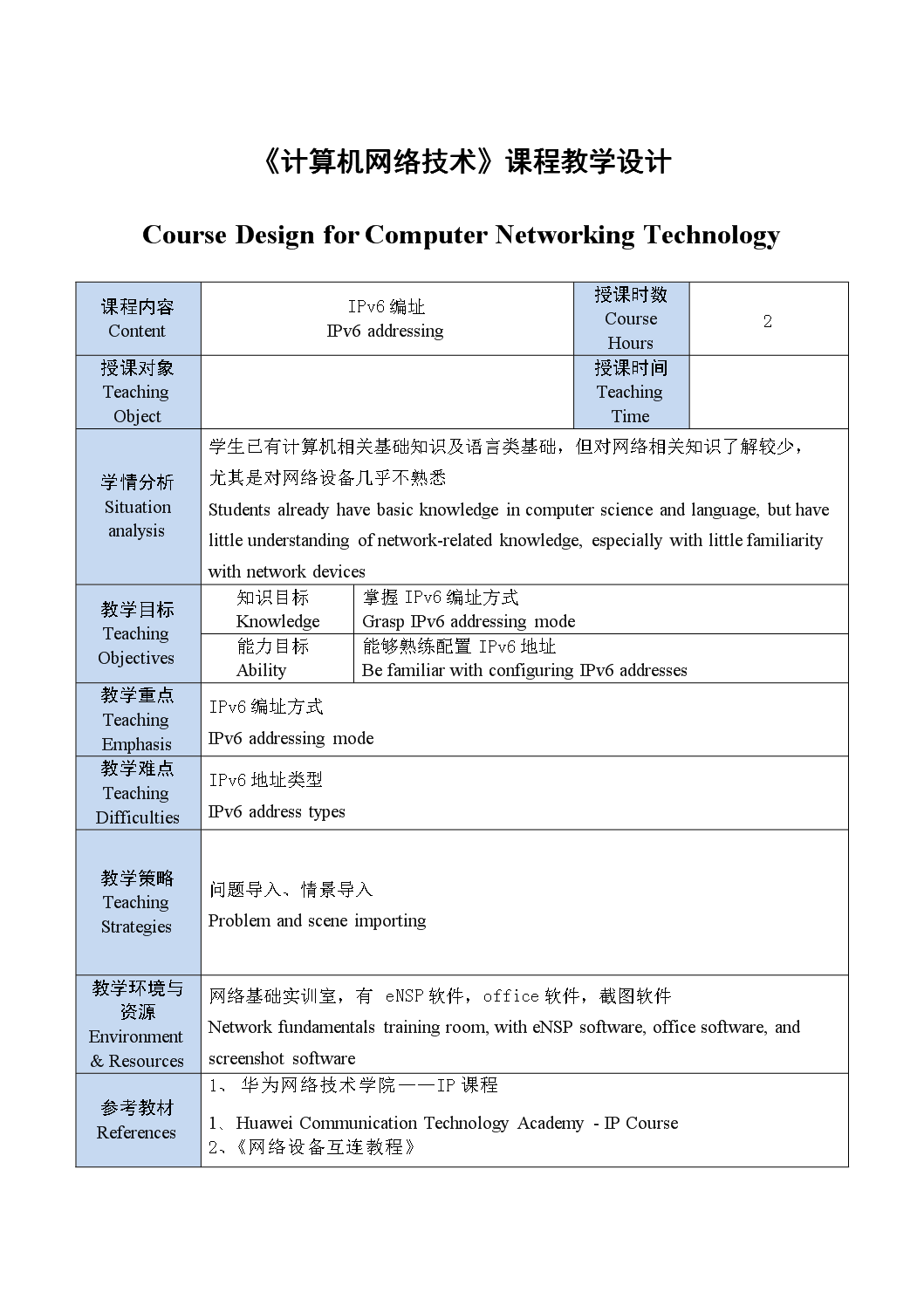 《计算机网络技术》教案——IPv6地址 Teaching Plan of Computer Networking Technology - IPv6 Address
