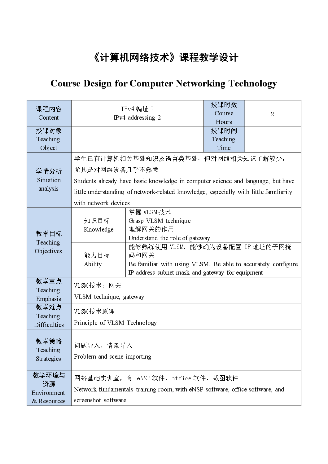 《计算机网络技术》教案——IP编址2 Teaching Plan of Computer Networking Technology - IP Addressing 2