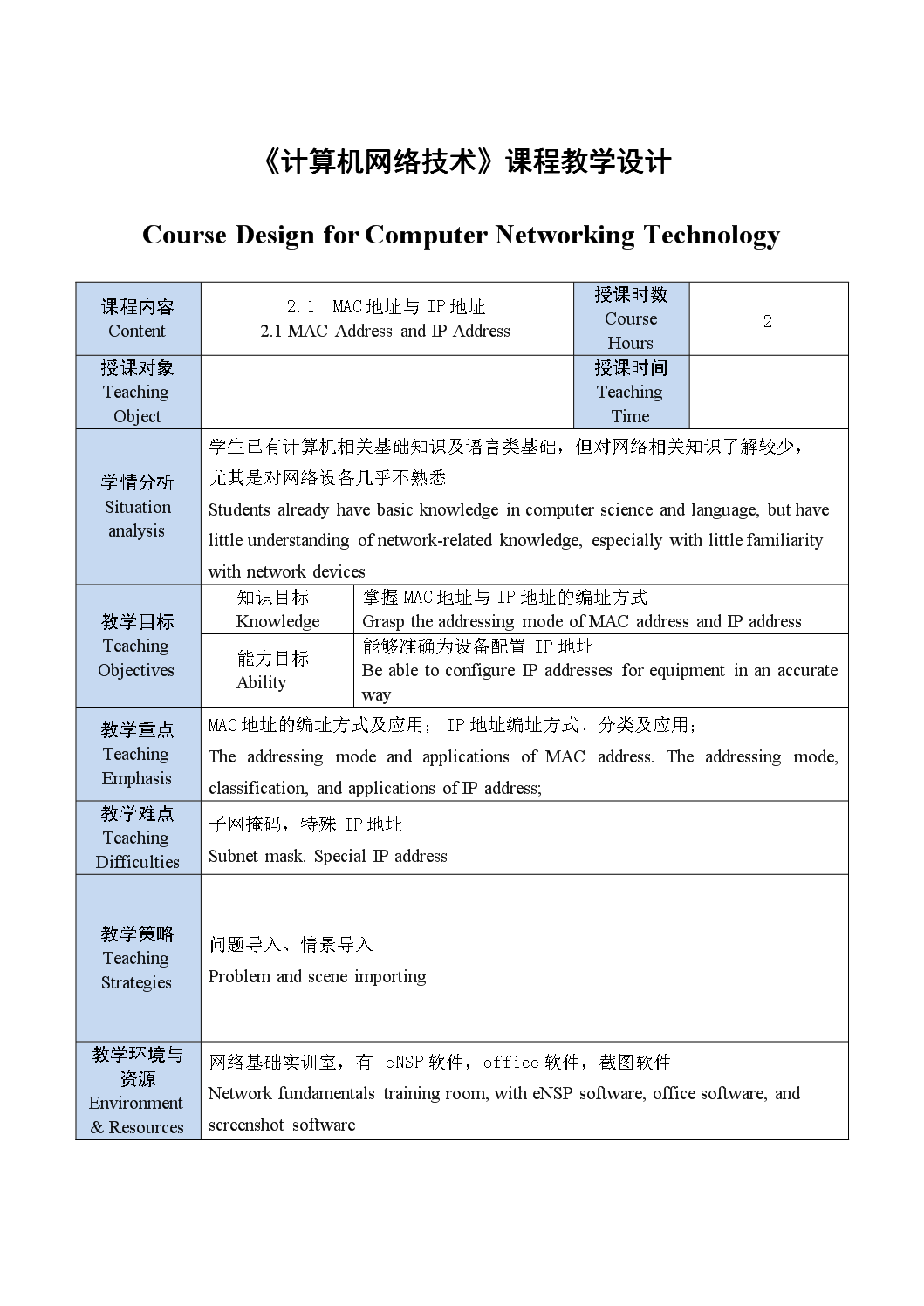 《计算机网络技术》教案——MAC地址与IP地址 Teaching Plan of Computer Networking Technology - MAC Address and IP Address